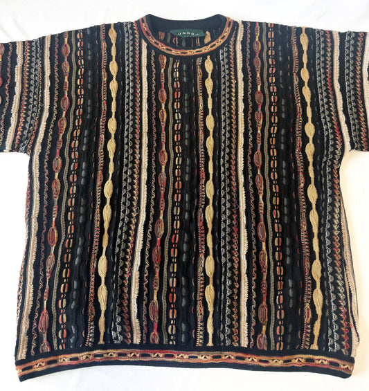 Vintage Tundra Canada Black Earth Tone Multicolor 3D Abstract Striped Sweater, Men's Sz. XL, 90s Coogi Style Grandpa Sweater