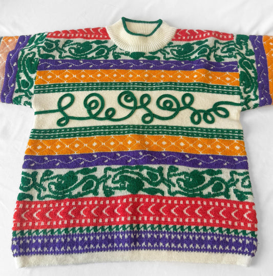 Vintage Cream/Off-White Multicolor Abstract Striped Swirl Design Cotton Mockneck Sweater, Approx. Women's Sz. M