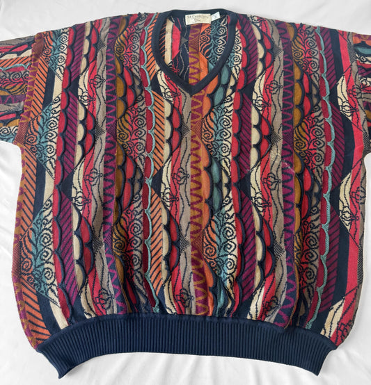 Vintage St. Croix Navy Multicolor 3D Striped Carpet Style V-Neck Sweater, Men's Sz. XL, Vintage Unisex Grandpa Coogi Style Sweater