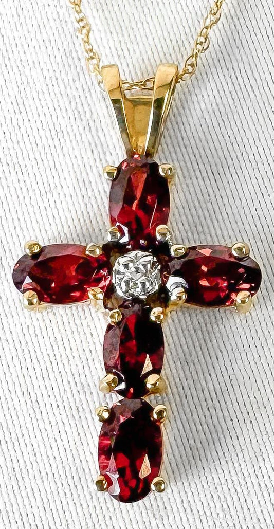 10K Yellow Gold Garnet Diamond Cross 18" Pendant Necklace, Unique Elegant Simple Everyday Necklace