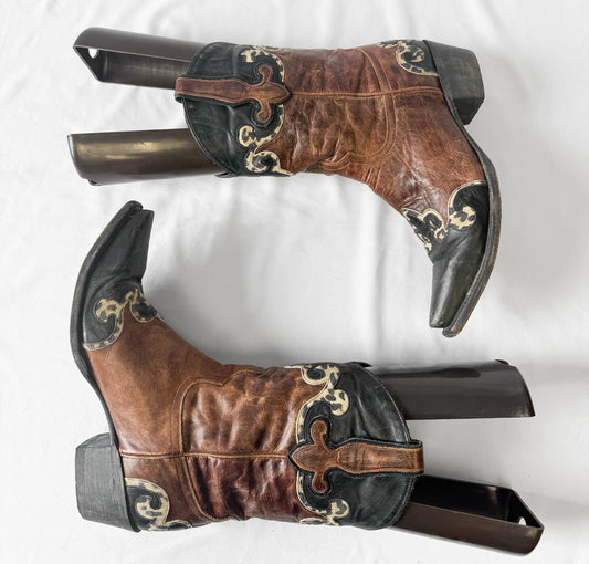 Lane Brown Black Leopard Animal Print Leather Cowboy Boots, Women's Sz. 8.5B, Unique Western Festival Boots