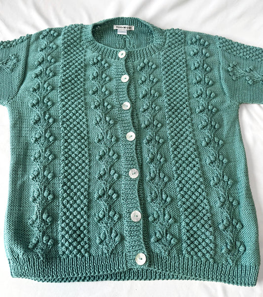 Vintage Style Teal Handknit Pure Pima Cotton Floral Knit Cardigan, Approx. Women's Sz. M/L
