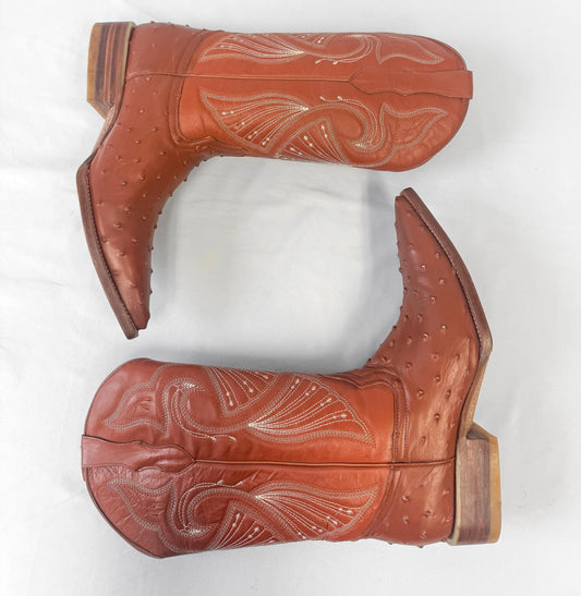 Vintage El Reparo Coral Ostrich Quill Leather Embroidered Cowboy Boots, Women's Sz. 7, Unique Statement Western Festival Boots
