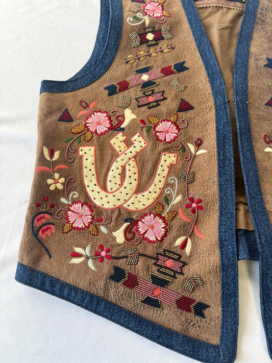 Scully Denim Leather Horseshoe Embroidered Beaded Vest, Women's Sz. S/M, Unique Western Festival Top