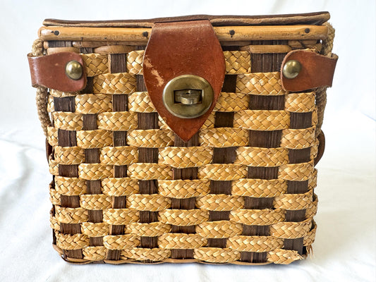 Vintage Wicker Leather Woven Square Mini Basket Top Handle Handbag, Unique Cottage Core Coquette Basket Bag