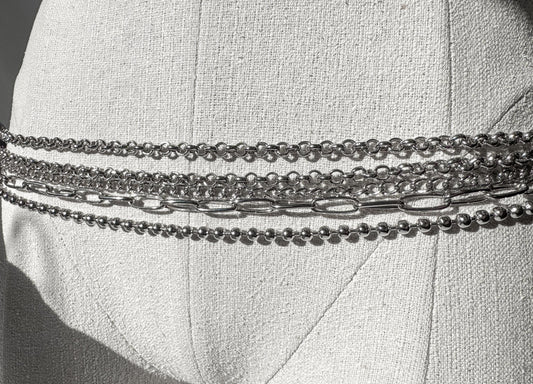 Silver Five Chain Layered Adjustable Chain Link Belt, 35" - 42" Waist, Alternative Emo Style Statement Belt