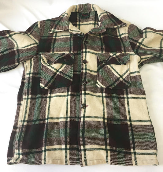 Vintage 50s Chippewa Falls Cream Brown Green Plaid Wool Shacket Coat, Approx. Men's M