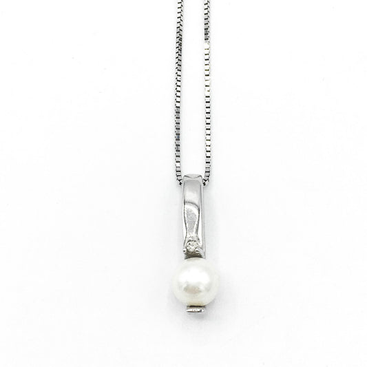 10K White Gold and Pearl and Genuine Diamond Necklace, 18" 10K Box Chain