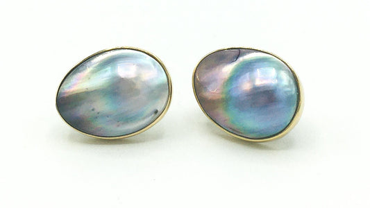 24K Gold Edge Blister Pearl Oval Stud Earrings, Unique Colored Pearl Earrings