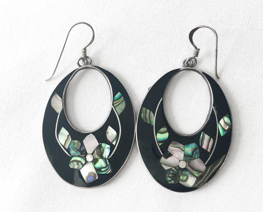 Vintage 925 Mexico Black Abalone Shell Floral Dangle Earrings, 1.5", Vintage Navajo Boho Jewelry