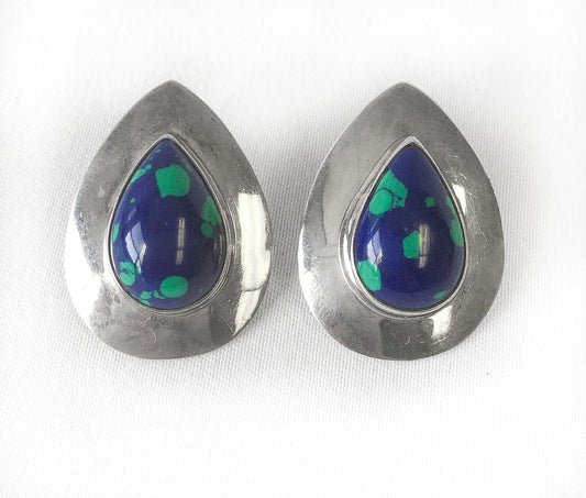 Vintage Sterling Silver S.E. Stamped Azurite Teardrop Stud Earrings, 1", Vintage Navajo Boho Earrings