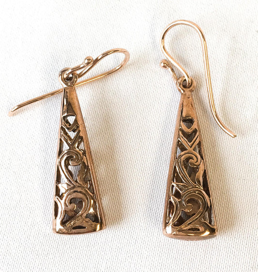 9K 375 Rose Gold Filigree Triangle Dangle Earrings, 1", 2.1 Grams Each, 4.2 Grams Total, Vintage Unique Boho Earrings