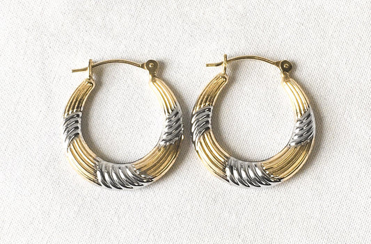 14K Two Tone Gold Textured Hollow Hoop Earrings, .75", 1.2 Grams Total, Simple Dainty Everyday Hoop Earrings