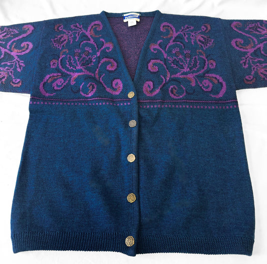 Vintage 90s Pendleton Navy/Dark Teal Purple Abstract Floral Pure Wool Button Cardigan, Women's Sz. L