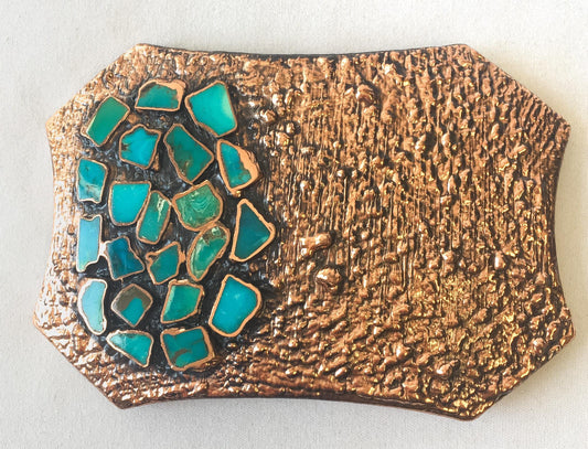 Vintage Copper Turquoise Inlay Textured Navajo Belt Buckle, Vintage Unique Statement Native American Western Navajo Belt Buckle