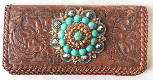 Vintage Handcrafted Floral Tooled Leather with Beaded Faux Turquoise Flower Detail, Vintage Western Boho Style Accessories