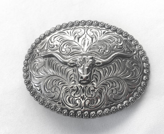 Metal Silver Toned Longhorn Engraved Oval Belt Buckle, 3.25" x 2.5", Vintage Western Accessories