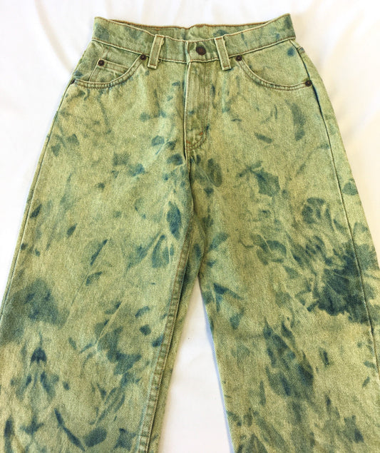 Vintage 70s Reworked Levi's 565 Orange Tab Custom-Dyed and Floral Sewn-In Patch Wide Leg Jeans, 24" Waist, Vintage Custom Levi's