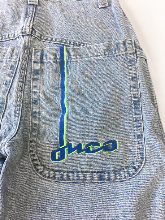 90s JNCO 2199 Boarder Neon Green/Blue Light Wash High Rise Denim Shorts, 26" Waist, Vintage Streetwear Jorts