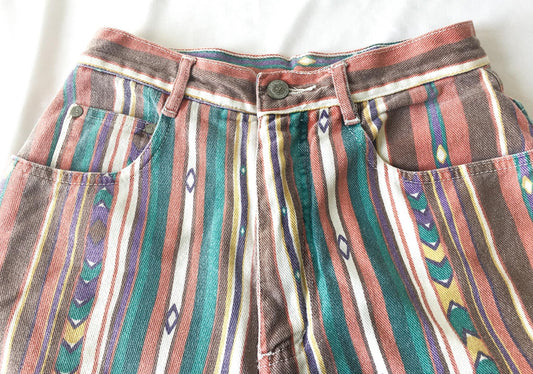 90s Gitano Rainbow Multicolor Striped Geometric Print Denim Shorts, Sz 24" Waist, Unique Denim Shorts